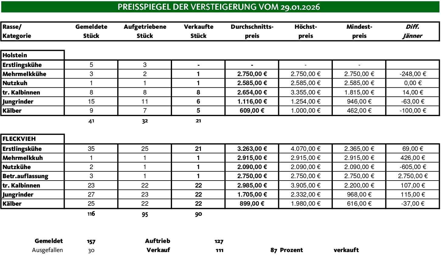 Der Beginn der Versteigerung in Lorenzen war verhalten, doch die Kauflaune nahm stetig zu und am Ende des Tages konnten gute Schnittpreise erzielt werden. Die Rasse Fleckvieh konnte in der Kategorie der Jungrinder ein absolutes Ausrufezeichen setzen mit einem erzielten Schnittpreis von 1.705 €. Die Auftriebszahlen waren mit 157 Tieren überschaubar (116 Fleckvieh-, 41 Holsteintiere).