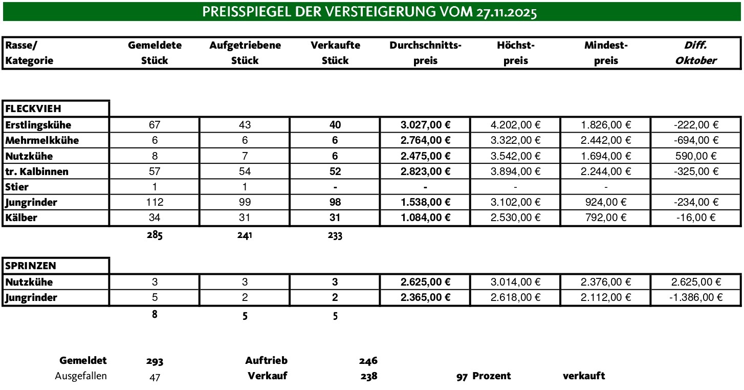 Die für November hohe Auftriebszahl von 293 Tieren lockten viele interessierte Kunden aus Südtirol und darüber hinaus in die Versteigerungshalle nach St. Lorenzen. Die Qualität der angebotenen Tiere war durchschnittlich. Besonders bei den Jungkühen fehlten bei einigen Exemplaren die Milchmenge. In Summe verlief die Novemberversteigerung für die Fleckviehzüchter recht zufriedenstellend. Erfreulich war die Präsenz von 11 Bio- Tieren.
