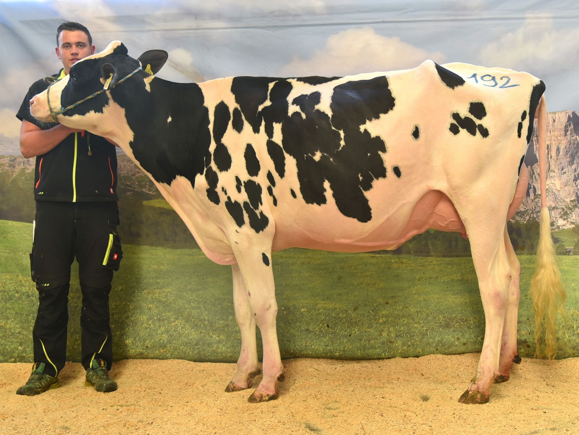 Kat. Nr. 192 👉 Die Erstlingskuh L. M. Ria von Moriggl Peter, Feldhof in Mals, mit 30 kg Milch wechselte für 4.114 € den Besitzer.