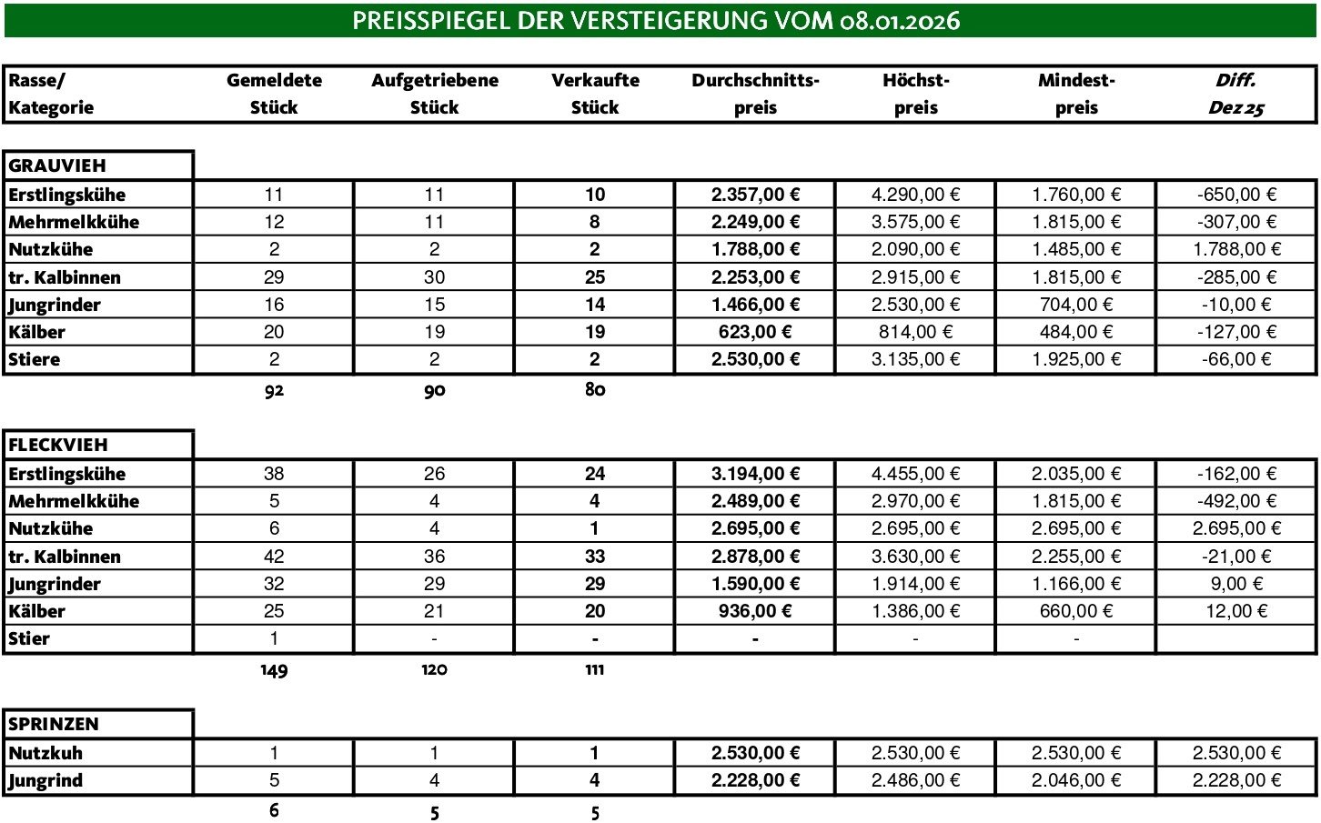Eine überaus gut besuchte Versteigerung konnte im Jänner abgehalten werden. Im Angebot standen 325 Tiere (92 Grauvieh-, 149 Fleckvieh-, 77 Holstein- 6 Sprinzen- und 1 Pinzgauertier). Die Nachfrage war verhaltener als in den Monaten zuvor. Zurückzuführen sicherlich zum Teil auf die geringere Qualität.
