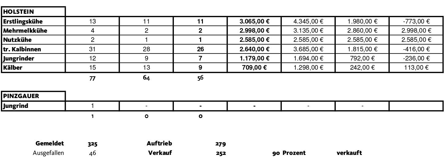 Es gab wiederum einige Exemplare, bei denen Spitzenpreise erzielt wurden. Mit einem Preis von 4.290 € erzielte ein Grauvieh- Erstlingskuh mit 24 kg Milch den Höchstpreis in ihrer Rassegruppierung. Diese Dobermann- Tochter stammt von Simon Taber, Kerscher aus Jenesien. Sie ging nach Schenna. Bei den Holstein- Erstlingskühen konnte ebenfalls 1 Exemplar einen Preis von über 4.000 € erzielen. So ging diese King- Doc Tochter von Johann Zingerle, Moar am Bach aus Reischach mit 38 kg Milch auf 4.345 €. Sie ging ins Villnösstal. Bei der Rasse Fleckvieh erzielte die teuerste Jungkuh, eine Epik- Tochter von Alois Gross, Moar in der Wies aus Sarnthein mit 4.455 € und 31 kg Milch den Höchstpreis. Sie ging nach Tisens. Bei den Sprinzen erzielte das Jungrind von Ignaz Unterholzner, Leitner aus Hafling einen ansehnlichen Preis von 2.486 €. Dieses ging ins Sarntal.